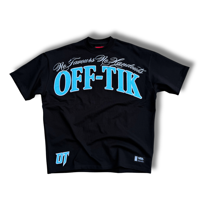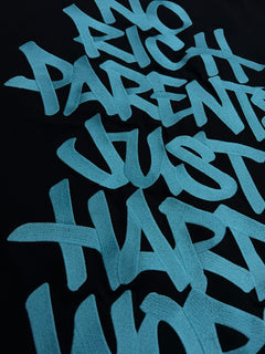 Oversized script tee for the ones who built it from nothing. Jet-black base with high-voltage aqua hits, OFFTIK™ arch and “No Favours No Handouts” across the back, and our “NO RICH PARENTS JUST HARD WORK” graffiti slammed loud as the main statement. A uniform piece for self-made operators only.